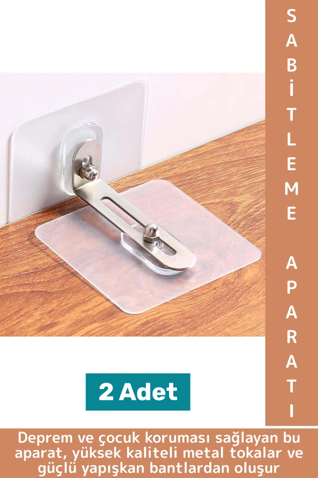 Deprem ve çocuk koruması sağlayan bu aparat, yüksek kaliteli metal tokalar ve güçlü yapışkan bantlardan oluşur. Kurulumdan sonra sağlam bir sabitleme sağlar ve uzun yıllar boyunca kullanılabilir. Gardırop, kitaplık, TV dolabı, şifonyer gibi mobilyalar için geniş bir kullanım alanına sahiptir.