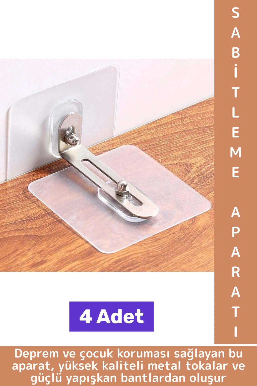 Deprem ve çocuk koruması sağlayan bu aparat, yüksek kaliteli metal tokalar ve güçlü yapışkan bantlardan oluşur. Kurulumdan sonra sağlam bir sabitleme sağlar ve uzun yıllar boyunca kullanılabilir. Gardırop, kitaplık, TV dolabı, şifonyer gibi mobilyalar için geniş bir kullanım alanına sahiptir.