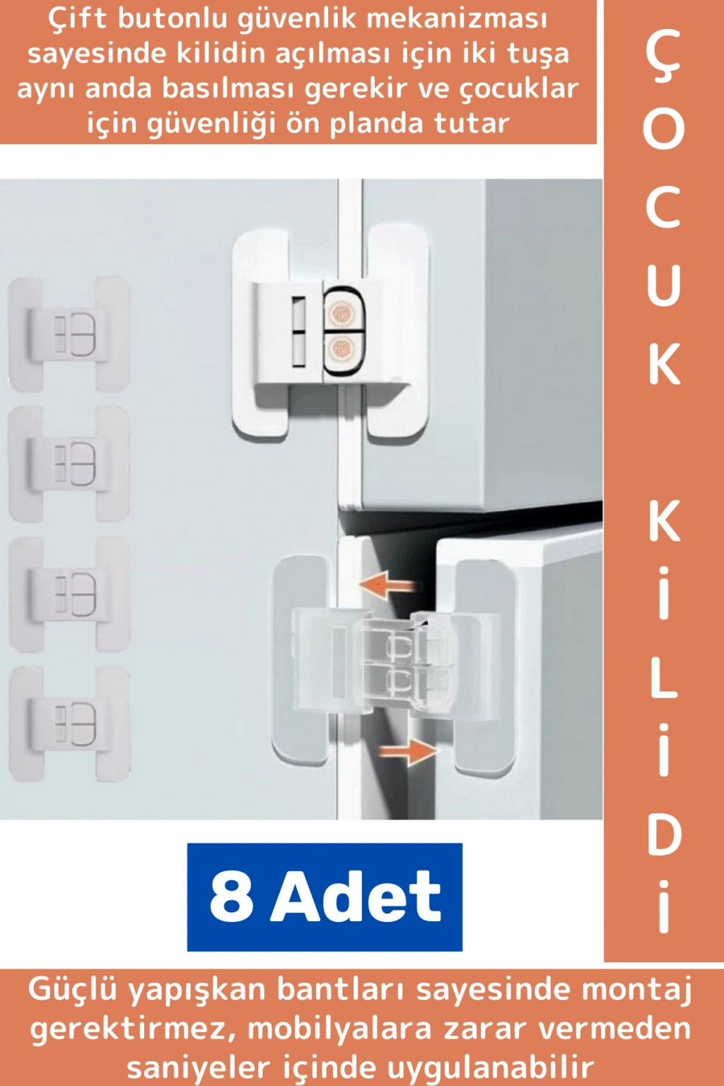 8 Adet Buzdolabı Çekmece ve Dolap Kapağı Çocuk Kilidi, evdeki tehlikeli alanlara çocukların erişimini engelleyerek güvenli bir yaşam alanı oluşturmak için tasarlanmış pratik bir güvenlik çözümüdür.