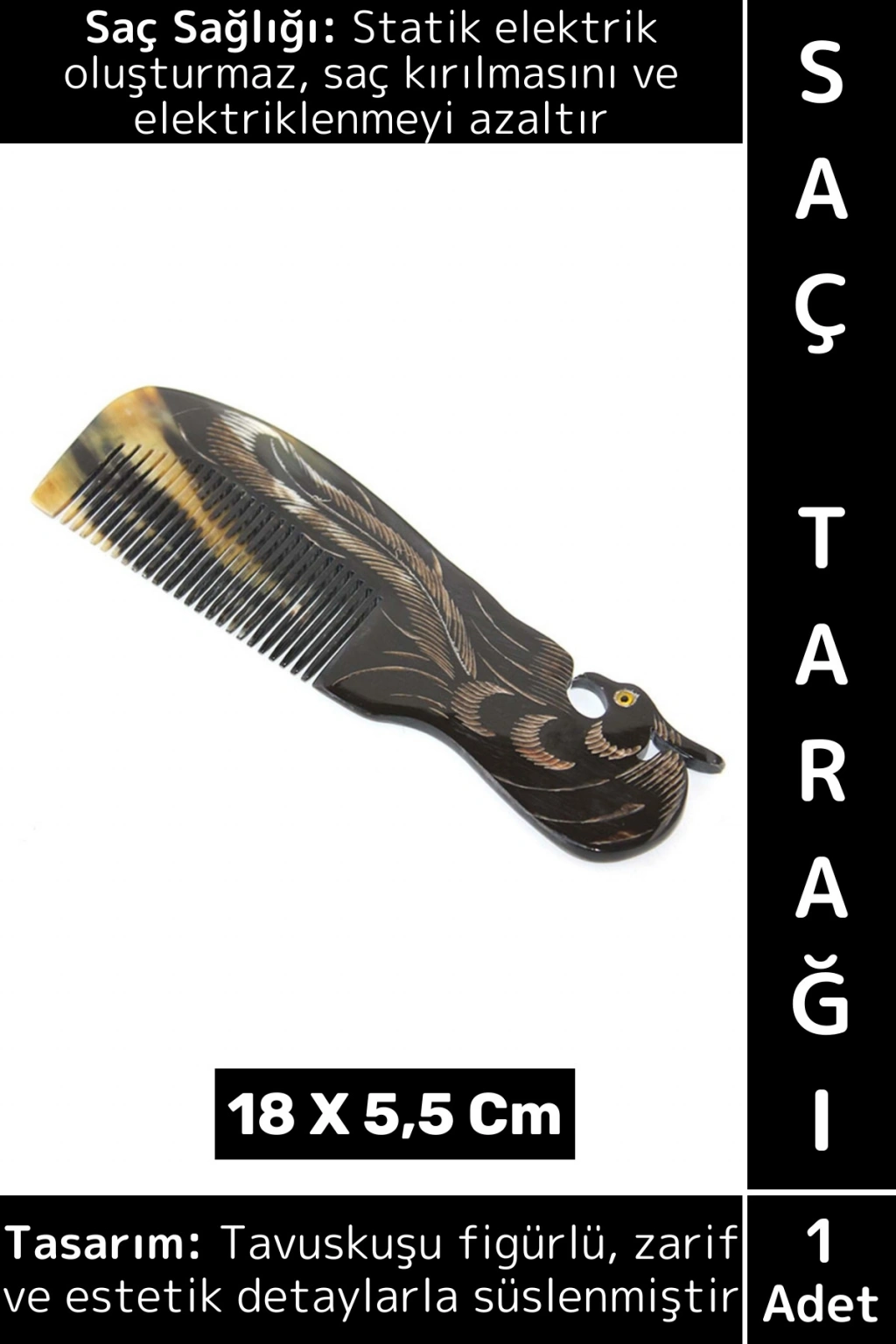 Tavuskuşu tasarımlı kemik tarak doğal kemikten üretilmiş veantistatik özellikleri sayesinde saç elektriklenmesini önler.Zarif tavuskuşu figürüyle estetik bir görünüm sunar ve koleksiyonluk değer taşır.