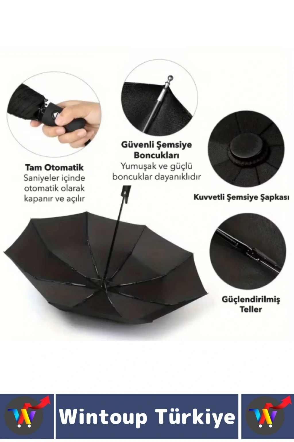 Tek tuşla otomatik açılma sistemi, ani yağmurlarda hızlı kullanım imkânı sağlar. Güçlendirilmiş 8 telli yapısı, rüzgârlı havalarda dayanıklılık sunarken, su geçirmez kaliteli kumaşıyla yağmurdan tam koruma sağlar. Ergonomik sap tasarımı rahat bir tutuş sunar, kendi kılıfı sayesinde şemsiye temiz ve düzenli şekilde saklanabilir. Hem günlük kullanım hem de seyahatler için ideal bir tercihtir.