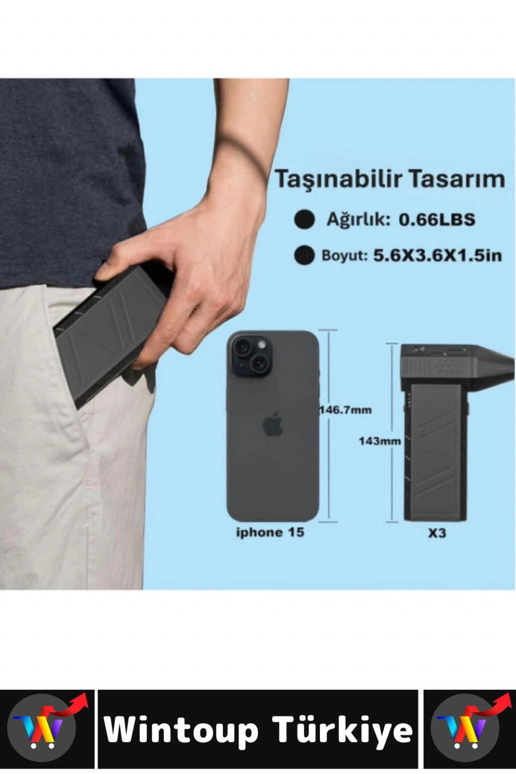 Type-C şarj girişi sayesinde hızlı şarj edilebilir ve uzun süreli kullanım imkânı sağlar. Kompakt boyutu ve hafif yapısı sayesinde cepte veya çantada kolayca taşınabilir. Güçlü motoru sayesinde kısa sürede etkili hava üflemesi yaparak zamandan tasarruf sağlar.