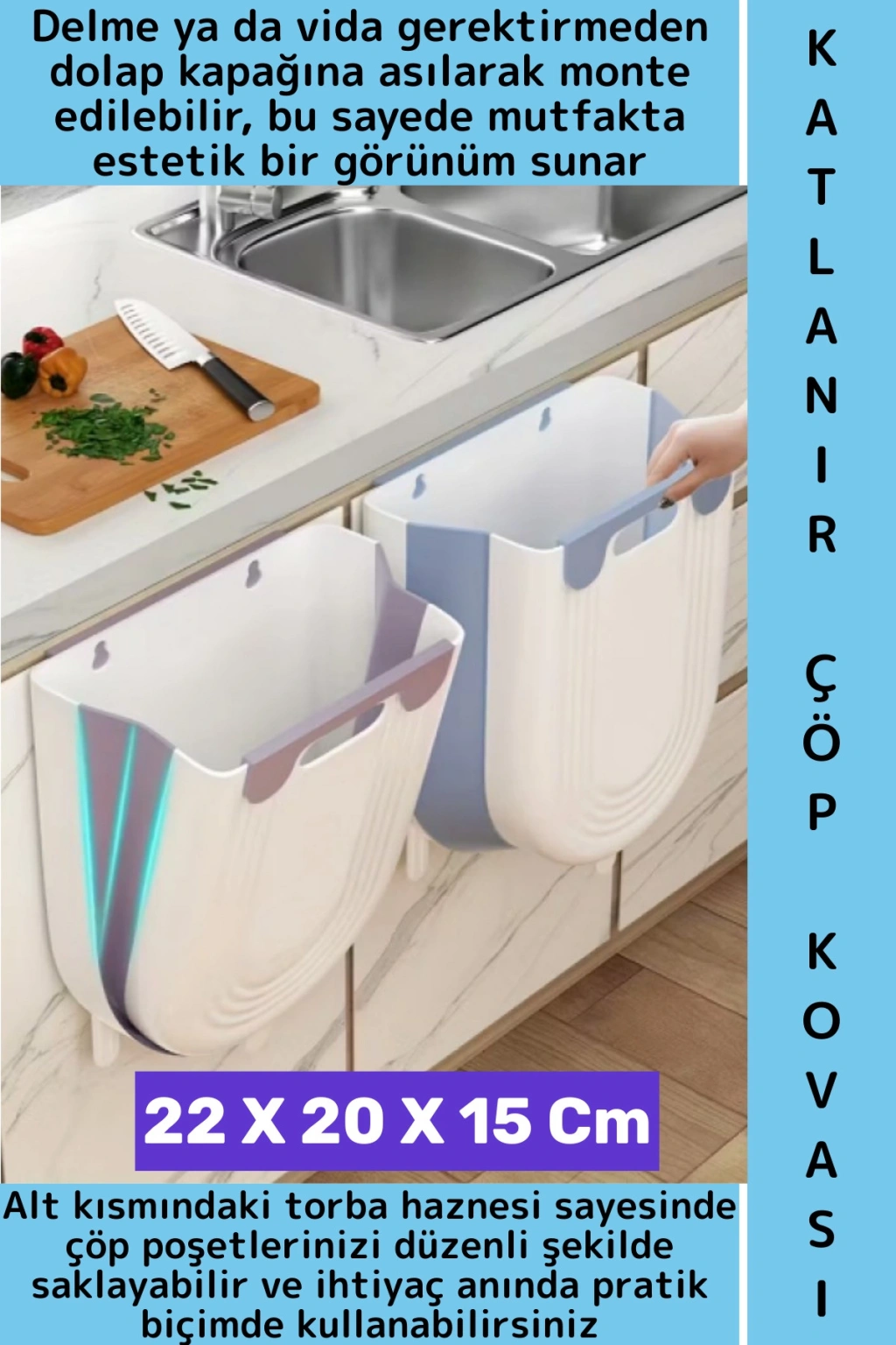22 x 20 x 15 cm boyutlarıyla mutfak, banyo, ofis, kamp ve karavan gibi alanlarda ideal bir çözümdür. Delme ya da vida gerektirmeden dolap kapağına asılarak monte edilebilir, bu sayede mutfakta estetik bir görünüm sunar.