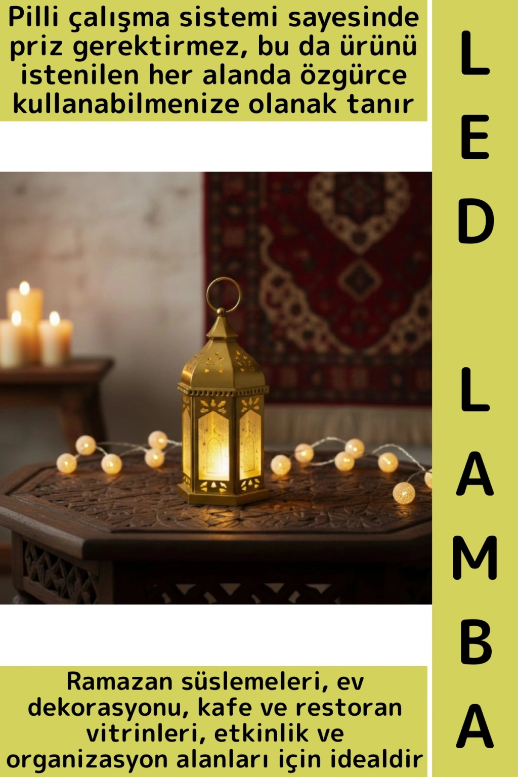 Pilli çalışma özelliği sayesinde priz veya kabloya ihtiyaç duymadan istenilen her alanda rahatlıkla kullanılabilir. Masa üstü, vitrin, pencere önü, raf, iftar sofrası ve Ramazan süslemeleri için ideal bir dekoratif tamamlayıcıdır. Evlerin yanı sıra kafe, restoran, ofis ve organizasyon alanlarında Ramazan ruhunu yansıtan estetik bir dokunuş sunar. Düşük enerji tüketimli LED yapısı sayesinde Ramazan ayı boyunca güvenle ve uzun süre kullanılabilir.