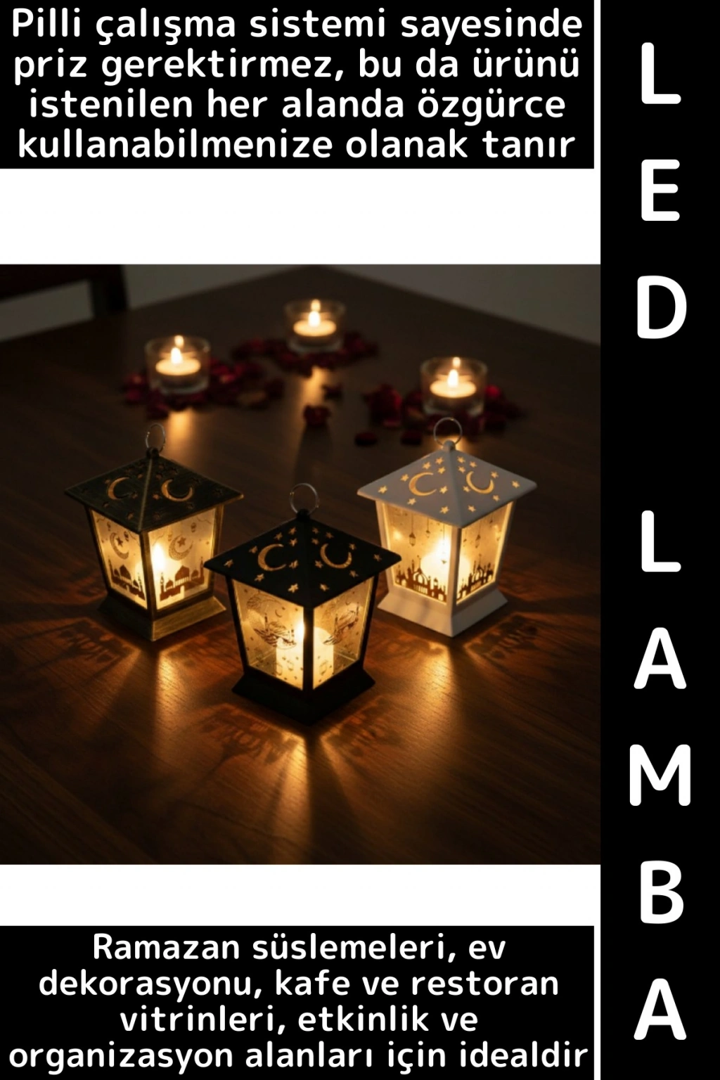 Plastik malzemeden üretilmiş olması sayesinde hafif ve dayanıklıdır, uzun süreli kullanım için uygundur. Masa üstü, vitrin, pencere önü, iftar sofraları, Ramazan köşeleri ve özel gün dekorasyonlarında rahatlıkla tercih edilebilir. Ev kullanımı dışında kafe, restoran, ofis ve mağaza vitrinlerinde de Ramazan konseptini tamamlayan dekoratif bir aksesuar olarak öne çıkar.