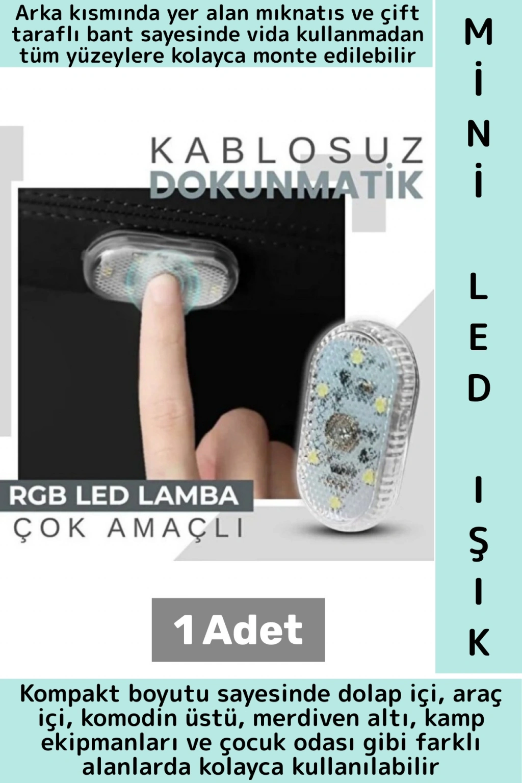 Kompakt boyutu sayesinde dolap içi, araç içi, komodin üstü, merdiven altı, kamp ekipmanları ve çocuk odası gibi pek çok farklı alanda kolayca kullanılabilir. 6 adet güçlü LED’i ile canlı, parlak ve enerji tasarruflu bir aydınlatma sunar. Dokunmatik yüzeyi sayesinde kısa dokunuşla renk modları arasında geçiş yapabilir, uzun dokunuşla ışığı açıp kapatabilirsiniz.