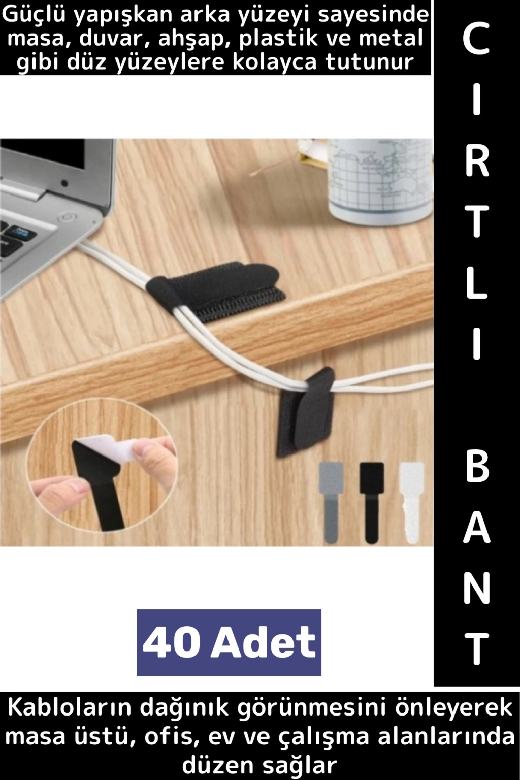 40 adet kendinden yapışkanlı cırt cırtlı bant, kablo düzenleme, sabitleme ve pratik montaj ihtiyaçları için ideal bir çözümdür. Güçlü yapışkan arka yüzeyi sayesinde masa, duvar, ahşap, plastik ve metal gibi düz yüzeylere kolayca tutunur ve ek yapıştırıcıya ihtiyaç duymaz. Kabloların dağınık görünmesini önleyerek masa üstü, ofis, ev ve çalışma alanlarında düzen sağlar. Defalarca açılıp kapatılabilen cırtlı yapısı sayesinde uzun süreli ve tekrar kullanılabilir kullanım sunar.Kompakt yapısı sayesinde hem ev elektroniği kablolarında hem de ofis ekipmanlarında pratik bir düzenleme çözümü sunar.