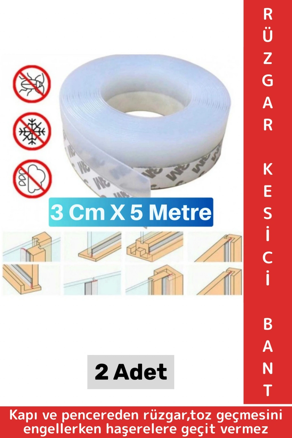 Özel Üretim Kapı Altı Pencere Rüzgar Böcek Haşere Önleyen Rüzgar Kesici Bant 3 Cm X 5 Metre 2 Adet