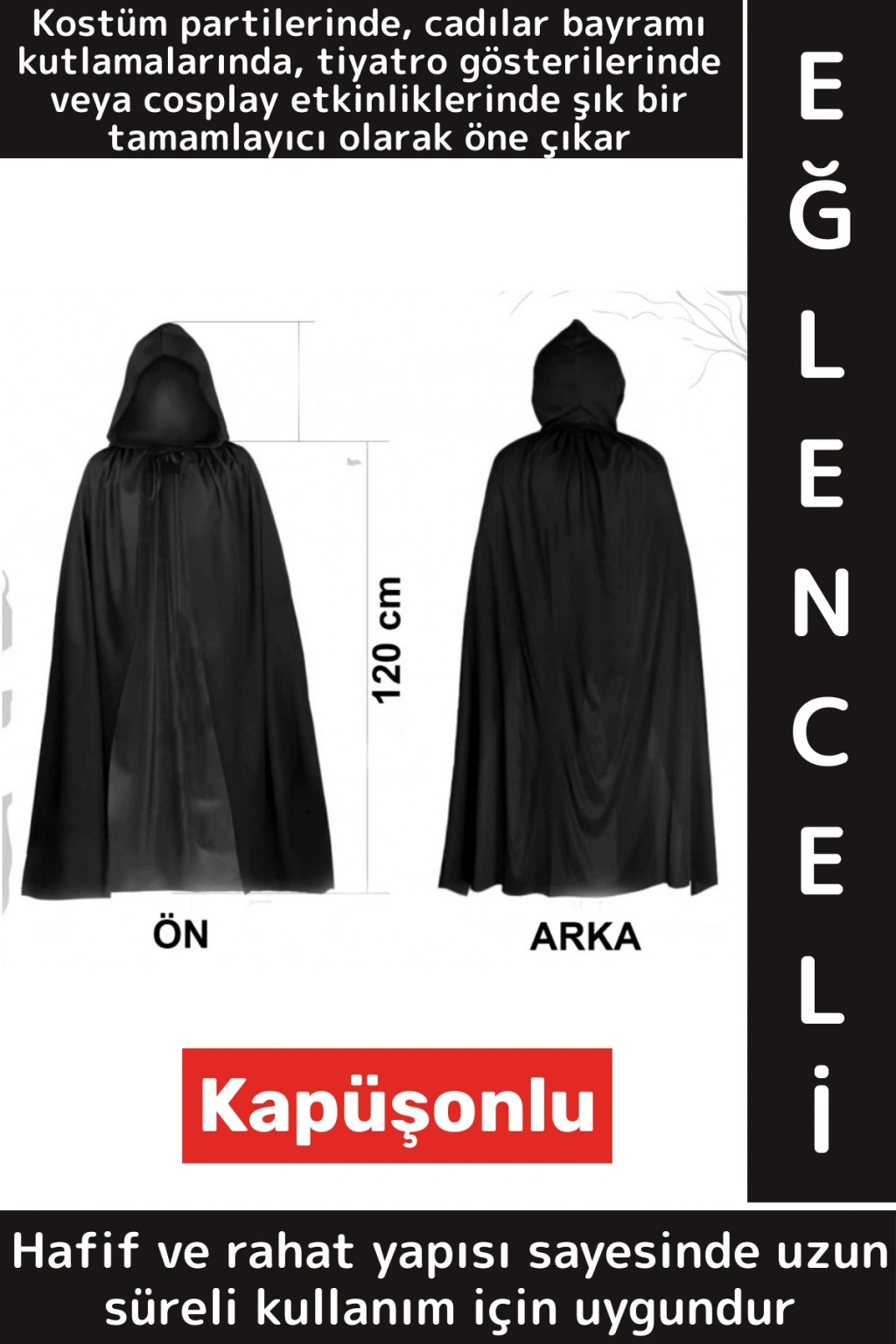Siyah uzun pelerin, 120 cm uzunluğuyla tam boy bir görünüm sağlar ve kapüşon detayı ile kostüm partilerinde, cadılar bayramı kutlamalarında, tiyatro gösterilerinde veya cosplay etkinliklerinde şık bir tamamlayıcı olarak öne çıkar. Hafif ve rahat yapısı sayesinde uzun süreli kullanım için uygundur.