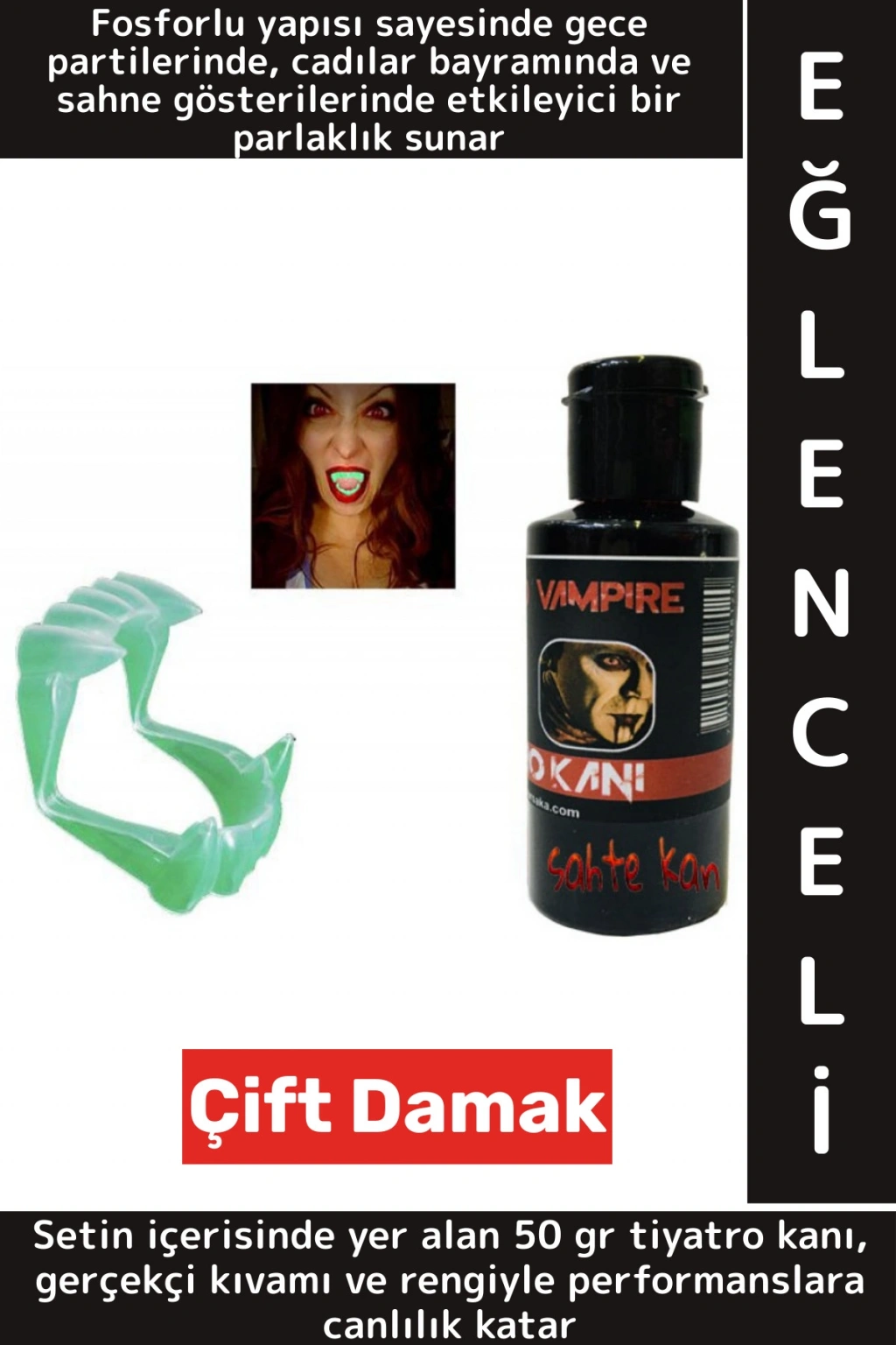 FOSFORLU ÇİFT DAMAK TAKMA VAMPİR DİŞİ VE 50 GR TİYATRO KANI SET