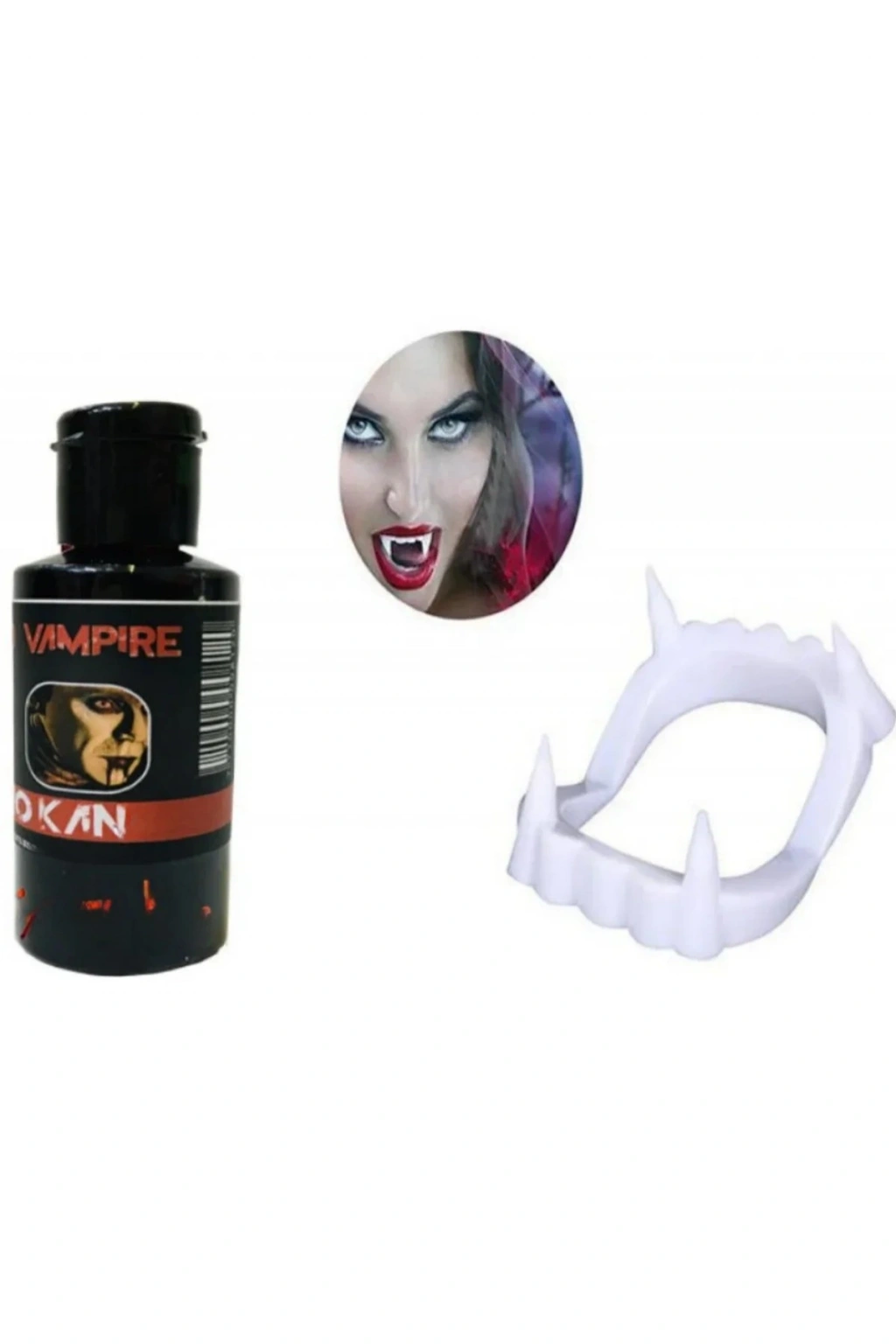 BEYAZ RENK ÇİFT DAMAK TAKMA VAMPİR DİŞİ VE 50 GR TİYATRO KANI SET