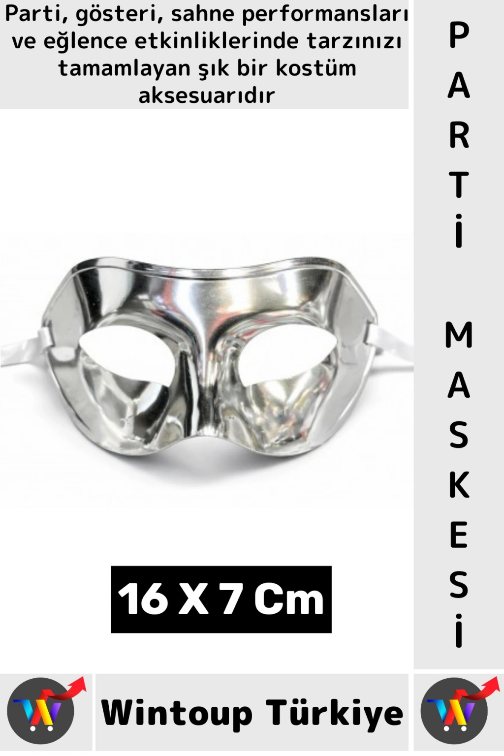 Şık ve dikkat çekici tasarımıyla öne çıkan metalize yüz maskesi, parti ve kostüm etkinlikleri için ideal bir aksesuardır.; Parlak yüzeyi sayesinde ışık altında etkileyici bir görünüm sunar ve kombinlerinizi tamamlayan güçlü bir stil oluşturur.; Ergonomik yapısı sayesinde yüz formuna kolayca uyum sağlar ve rahat bir kullanım sunar.; Esnek bağlama sistemi sayesinde kolayca takılıp çıkarılabilir.; Hem kadın hem erkek kullanımı için uygundur.; Partilerde, gösterilerde, sahne performanslarında ve eğlence etkinliklerinde tarzınızı tamamlayan pratik ve şık bir kostüm aksesuarıdır.; Ürün Özellikleri Parlak metalize yüzey Hafif ve rahat kullanım Yüz formuna uyumlu tasarım Kadın ve erkek kullanımı için uygun Parti ve kostüm etkinlikleri için ideal aksesuar