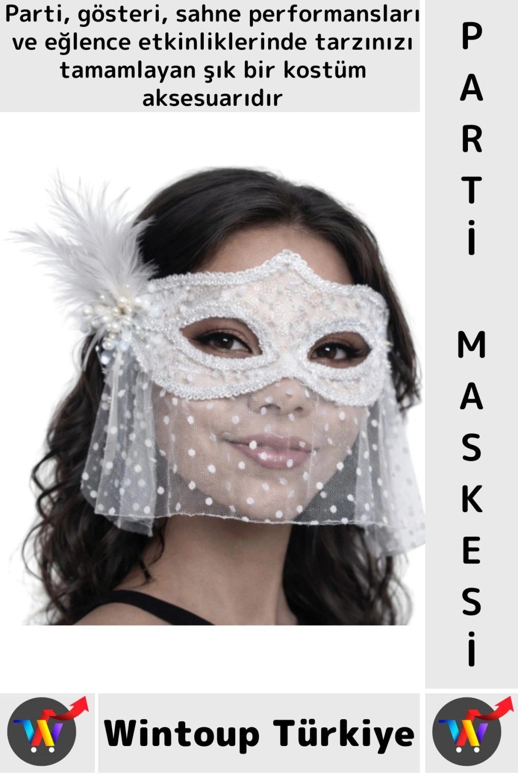 Puantiyeli ince tül peçesi yaklaşık 20 cm uzunluğunda olup maskeye zarif bir hareket kazandırır. Yan kısmında yer alan tüylü ve inci detaylı aksesuar ile zenginleştirilen peçeli maske modeli, gösterişli ve şık bir görünüm sağlar. İnce bağlama kurdelesi sayesinde kolayca sabitlenebilen maske, hafif yapısı ile rahat kullanım sunar. Parti, balo, kostüm etkinliği ve özel konsept organizasyonlarda kombinlerin tamamlayıcı parçası olarak tercih edilebilir.