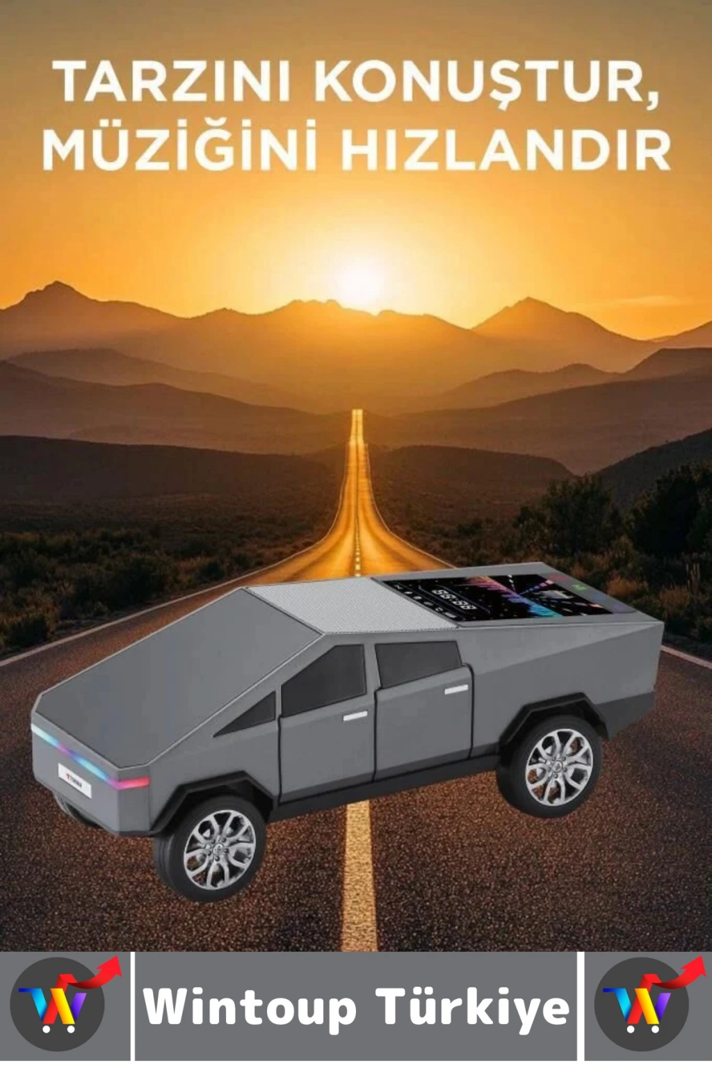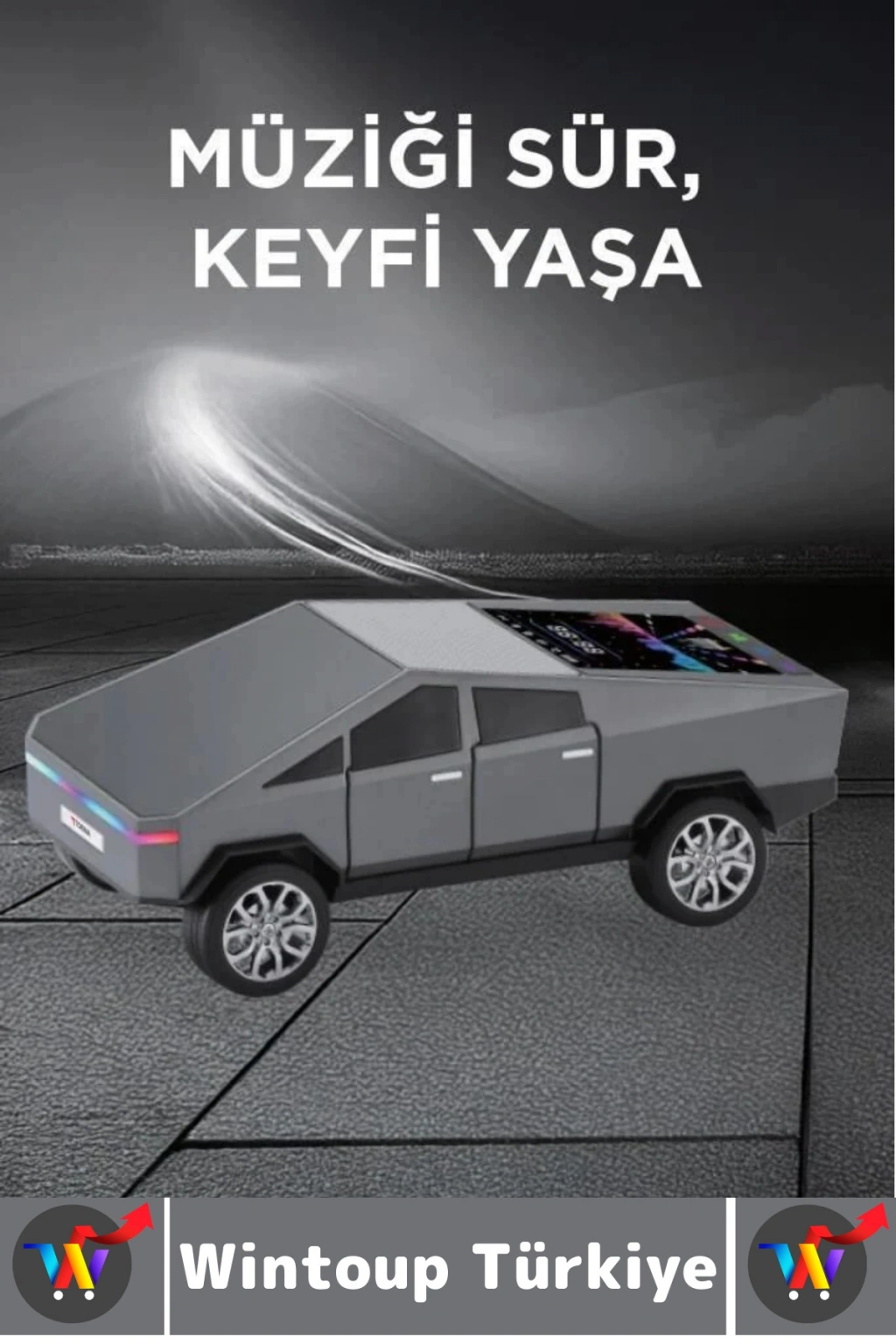 Kablosuz hoparlör ile müziğinizi yollara taşıyın! Modern CyberTruck esintili tasarımıyla dikkat çeken bu hoparlör, sadece bir ses cihazı değil, aynı zamanda şık bir aksesuar.