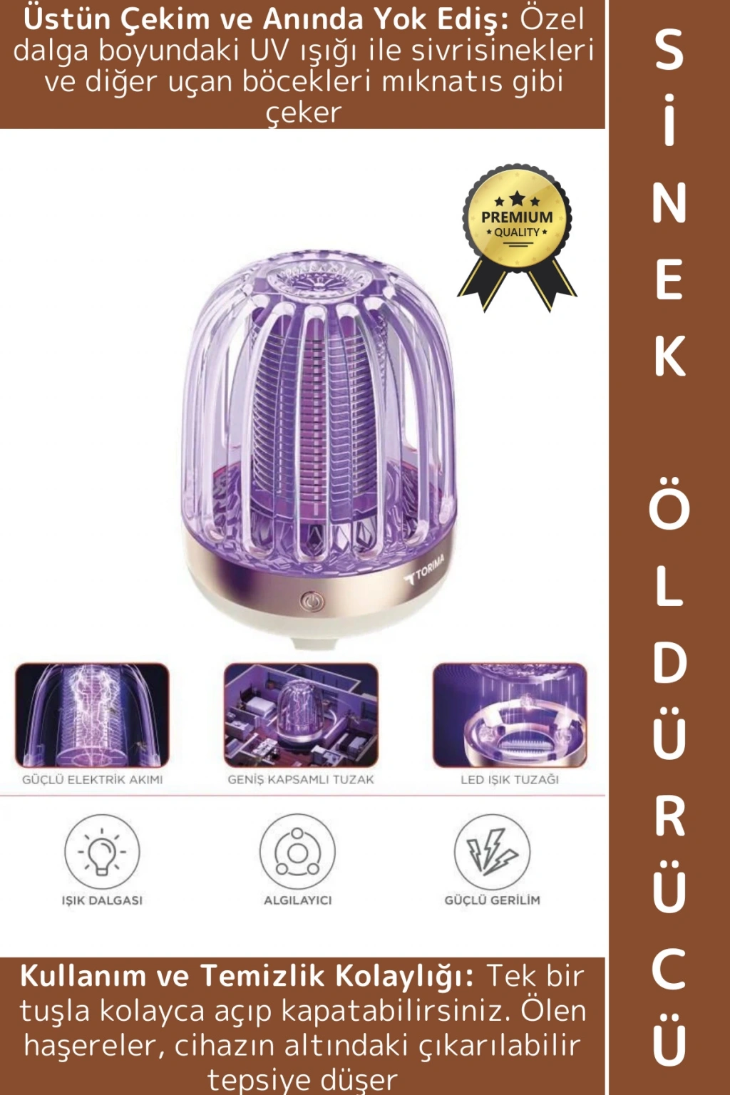 Kolay Kullanım ve Temizlik:Tek tuşla kolayca çalıştırın. Ölen sinekler, cihazın altındaki çıkarılabilir tepsiye düşer. Bu tepsiyi kolayca çıkarıp temizleyerek hijyen sağlayabilirsiniz.