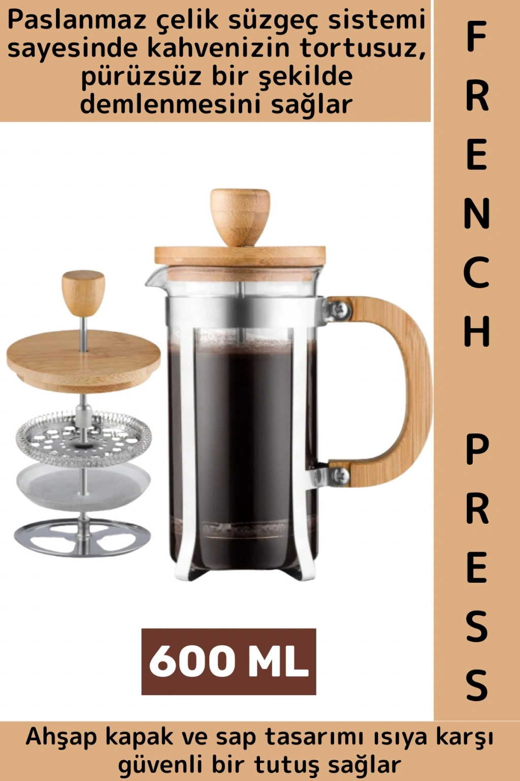Doğal ahşap kapak ve sap detayı, hem estetik bir görünüm kazandırır hem de ısıya karşı güvenli bir tutuş sağlar. 600 ml kapasitesi sayesinde birkaç fincan kahveyi aynı anda hazırlayabilir, bitki çayları veya aromatik içecekler için de kullanabilirsiniz. Kolay temizlenebilir yapısı ile hem pratik hem de uzun ömürlü bir kullanım sunar.