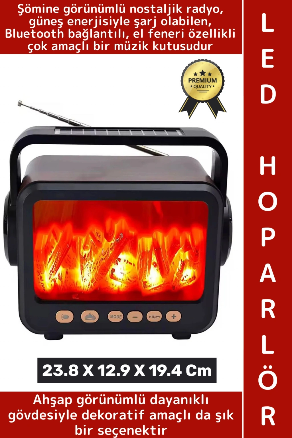 Şömine görünümlü nostaljik radyo, güneş paneliyle şarj olabilen, Bluetooth bağlantılı, MP3 çalar ve el feneri özellikli çok amaçlı bir müzik kutusudur.