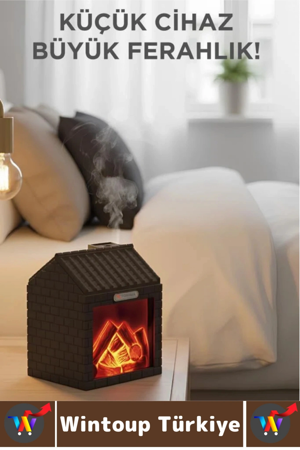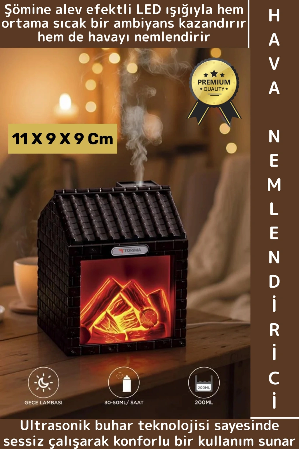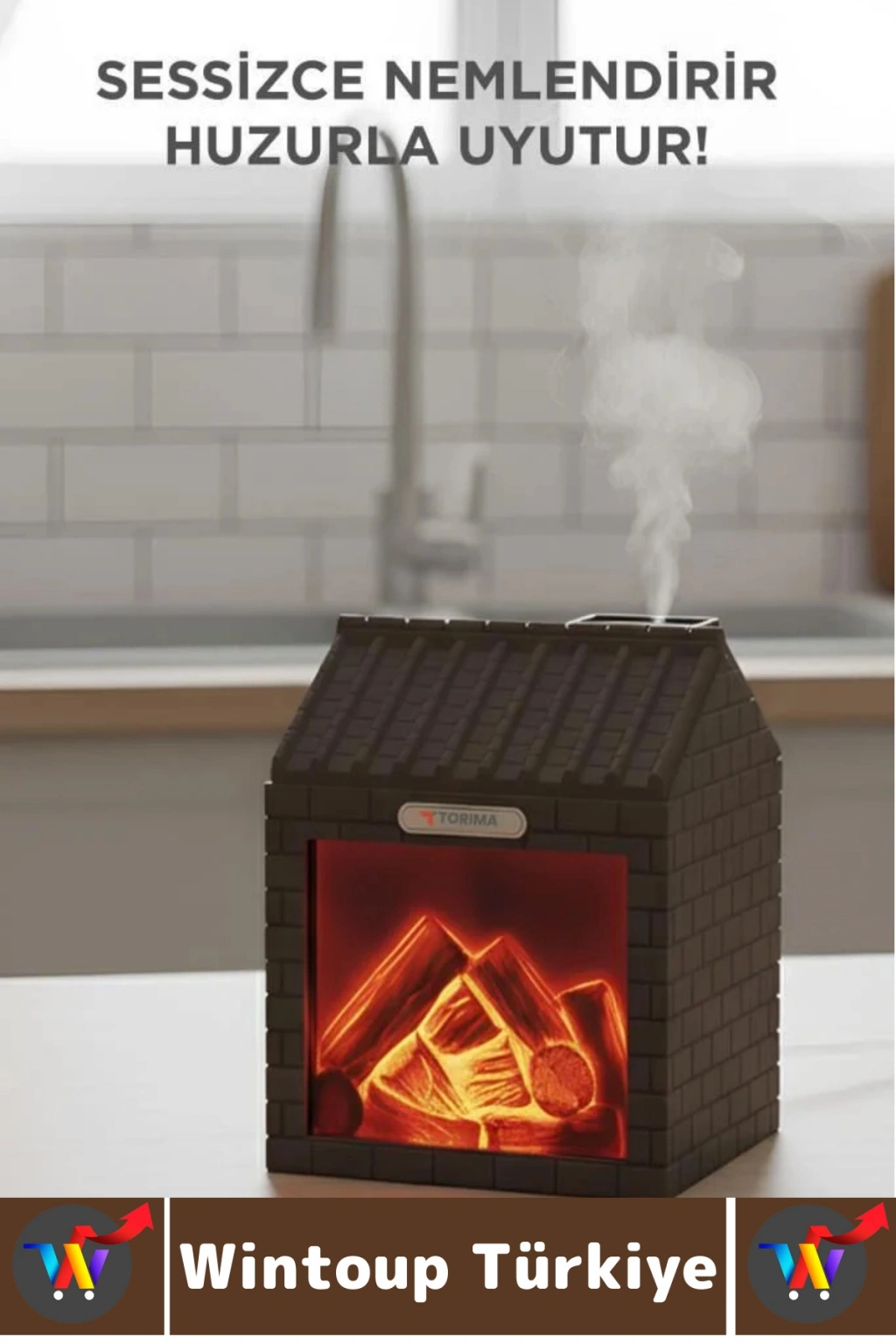 Ev şeklindeki tasarımı ve şömine alev efektli LED ışığıyla hem ortama sıcak bir ambiyans kazandırır hem de havayı nemlendirir. Ultrasonik buhar teknolojisi sayesinde sessiz çalışarak konforlu bir kullanım sunar. 200 ml su haznesi, uzun süreli nemlendirme sağlar. Dekoratif tasarımıyla yatak odası, ofis, bebek odası ve salonlarda estetik bir görünüm oluşturur.