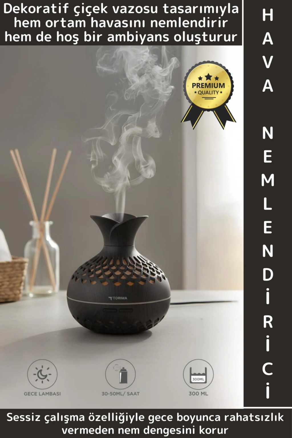 Flower Hava Nemlendirici, dekoratif çiçek vazosu tasarımıyla hem ortam havasını nemlendirir hem de hoş bir ambiyans oluşturur. Ultrasonik buhar teknolojisi sayesinde sessiz çalışır ve gece kullanımına uygundur. LED gece lambası özelliği ile uyku, ofis, bebek odası ve salon gibi alanlarda şık bir tamamlayıcıdır. 300ml su haznesi ile uzun süreli nemlendirme sağlar.