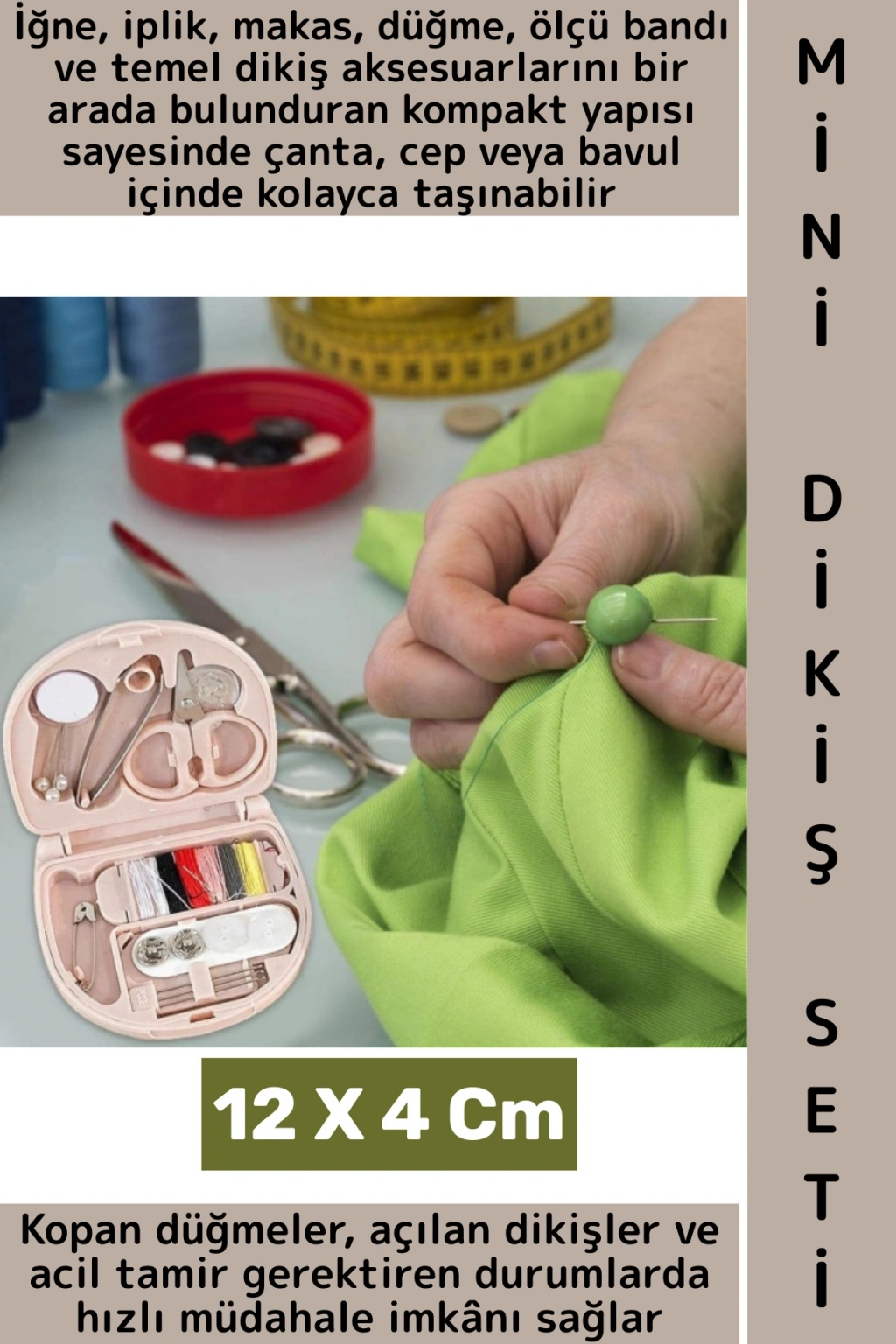 Uzun ömürlü ve kaliteli içerikleriyle defalarca kullanıma uygundur ve farklı kumaş ile kıyafetler için çeşitli iplik renkleri sunarak işlevselliği artırır. Kopan düğmeler, açılan dikişler ve acil tamir gerektiren durumlarda hızlı müdahale imkânı sağlar.