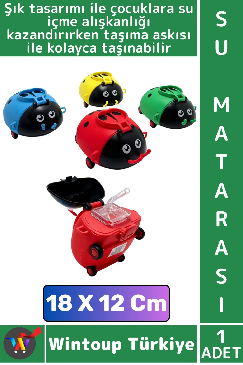 Uğur Böceği Tasarımlı Tekerlekli Çocuk Matarası askılı ve pipetli tasarıma sahip olup 1. derece kaliteli malzemeden üretilmiş olup, sağlıklı ve dayanıklı bir kullanım sunar. Hafif ve ergonomik tasarımıyla taşıması oldukça kolaydır. İçeceğin dökülmesini önleyen sızdırmaz kapak sistemine sahiptir. Spor, okul, ofis veya günlük kullanım için mükemmel bir seçimdir. Sevimli tasarımıyla çocuklara su içme alışkanlığı kazandırır