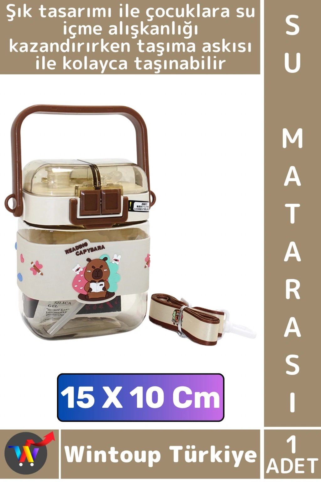 Sevimli Figürlü Çocuk Matarası askılı ve pipetli tasarıma sahip olup 1. derece kaliteli malzemeden üretilmiş olup, sağlıklı ve dayanıklı bir kullanım sunar. Hafif ve ergonomik tasarımıyla taşıması oldukça kolaydır. İçeceğin dökülmesini önleyen sızdırmaz kapak sistemine sahiptir. Spor, okul, ofis veya günlük kullanım için mükemmel bir seçimdir. Sevimli tasarımıyla çocuklara su içme alışkanlığı kazandırır