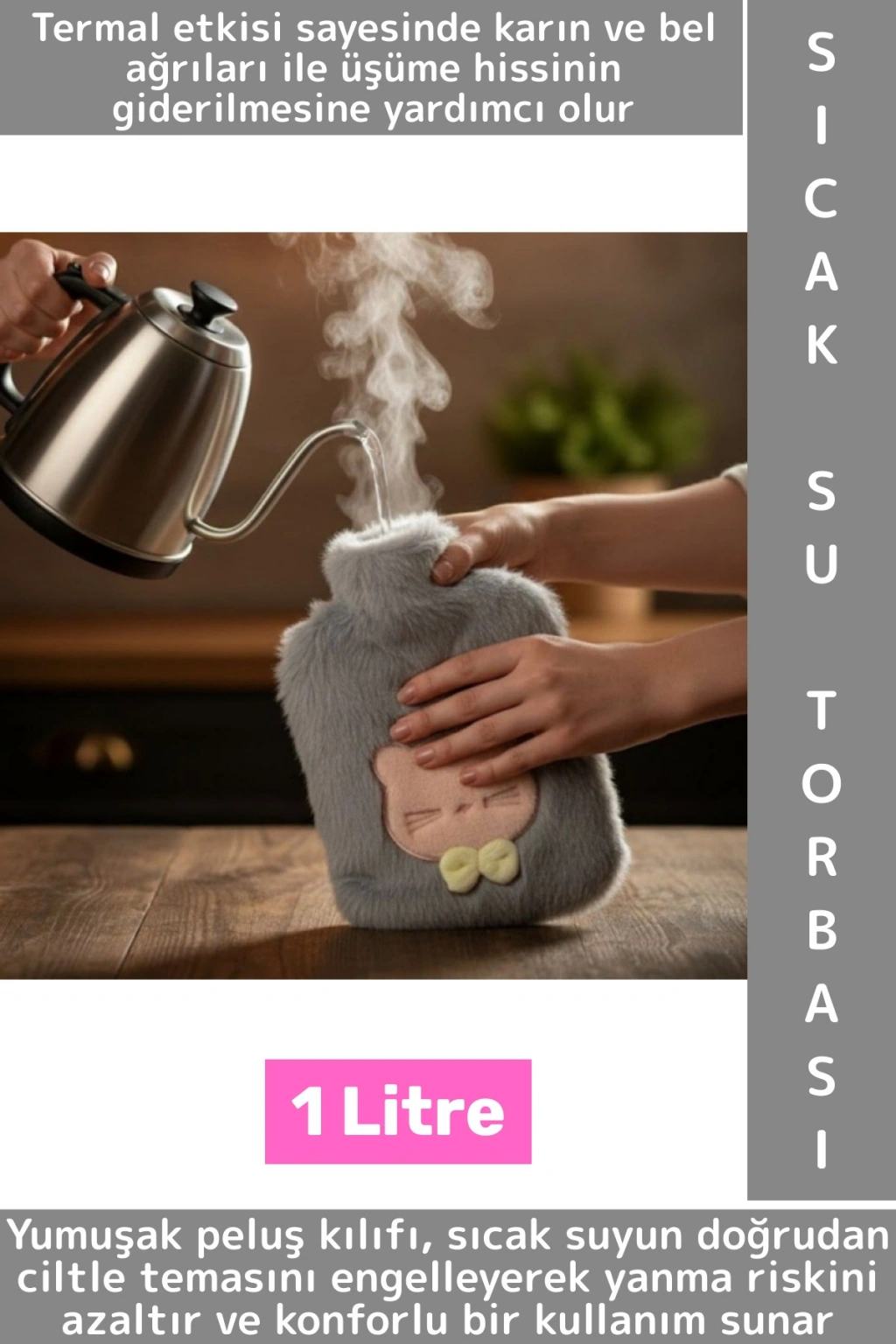 Termal etkisi sayesinde karın ve bel ağrıları, regl dönemi sancıları, kas ve eklem tutulmaları ile soğuk havalarda oluşan üşüme hissinin giderilmesine yardımcı olur. Evde dinlenirken, uyku öncesi yatakta, ofiste masa başında ya da seyahatlerde pratik ve güvenli bir sıcak terapi ürünü olarak tercih edilebilir. Günlük kullanımda hem işlevsel hem de estetik bir sıcak su torbası arayanlar için ideal bir üründür.