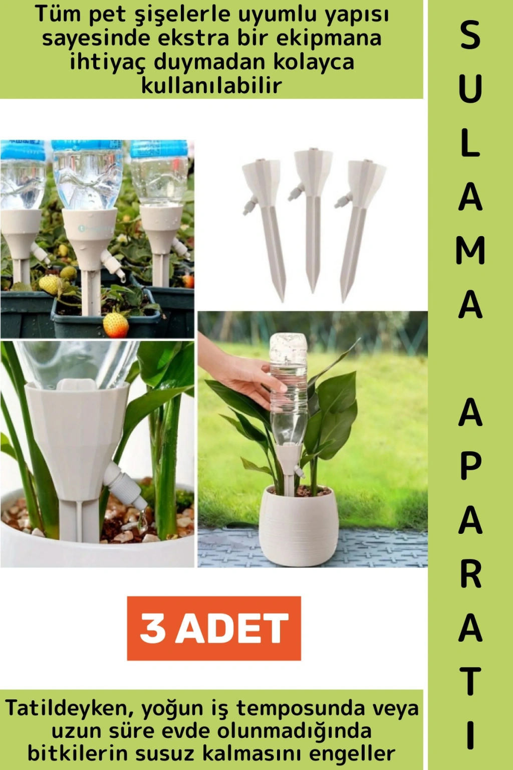 Tatildeyken, yoğun iş temposunda veya uzun süre evde olunmadığında bitkilerin susuz kalmasını engeller. Uzun ömürlü ve çevre dostu plastik malzemeden üretilmiş olup iç mekân bitkilerinden balkon ve bahçe bitkilerine, seralardan saksı çiçeklerine kadar geniş bir kullanım alanı sunar.