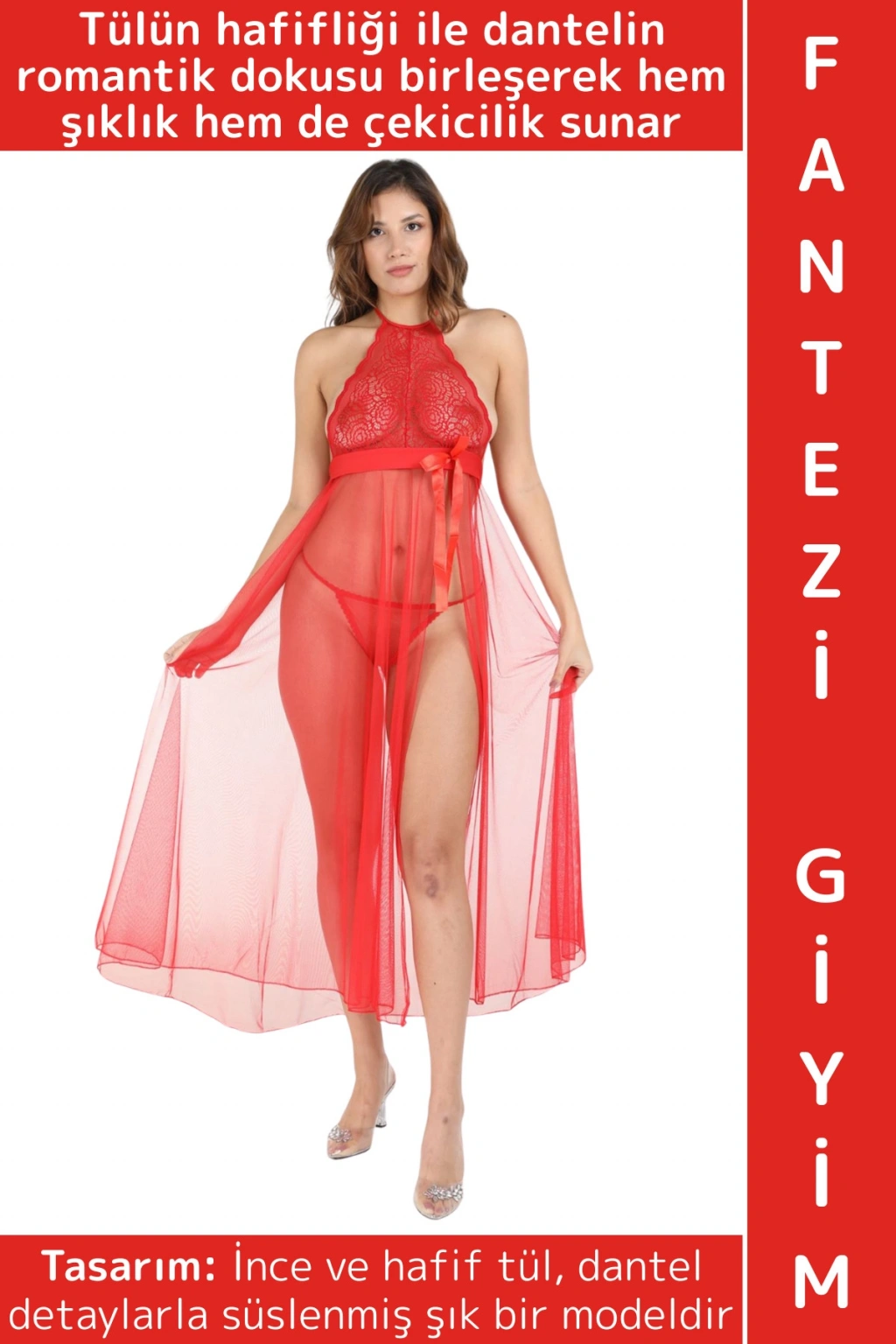 Dantelli tül fantezi gecelik, zarif ve feminen bir modeldir. Tülün hafifliği ile dantelin romantik dokusu birleşerek hem şıklık hem de çekicilik sunar.