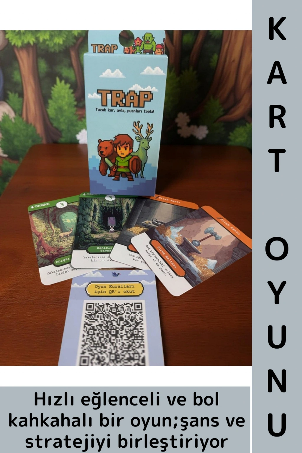 Ormanın derinliklerinde birbirinden tehlikeli canavarlar dolaşıyor… ve onları yakalamak için tek gereken şey zekice kurulmuş bir tuzak! Her tur bir hamle yapar, tuzak yerleştirir veya ganimet avantajlarıyla rakiplerine fark atarsın. Tuzaklarına düşen her canavarın bir puan değeri vardır; güçlü canavarlar daha fazla puan kazandırır, ama onları yakalamak da bir o kadar risklidir. Doğru anda doğru tuzağı kur, rakiplerinin önünü kes ve en değerlileri sen kap! Oyun sonunda en yüksek puanı toplayan oyuncu TRAP’in efsanesi ilan edilir. Zekâ, şans ve cesaret… Hepsi bu ormanda sınanacak!
