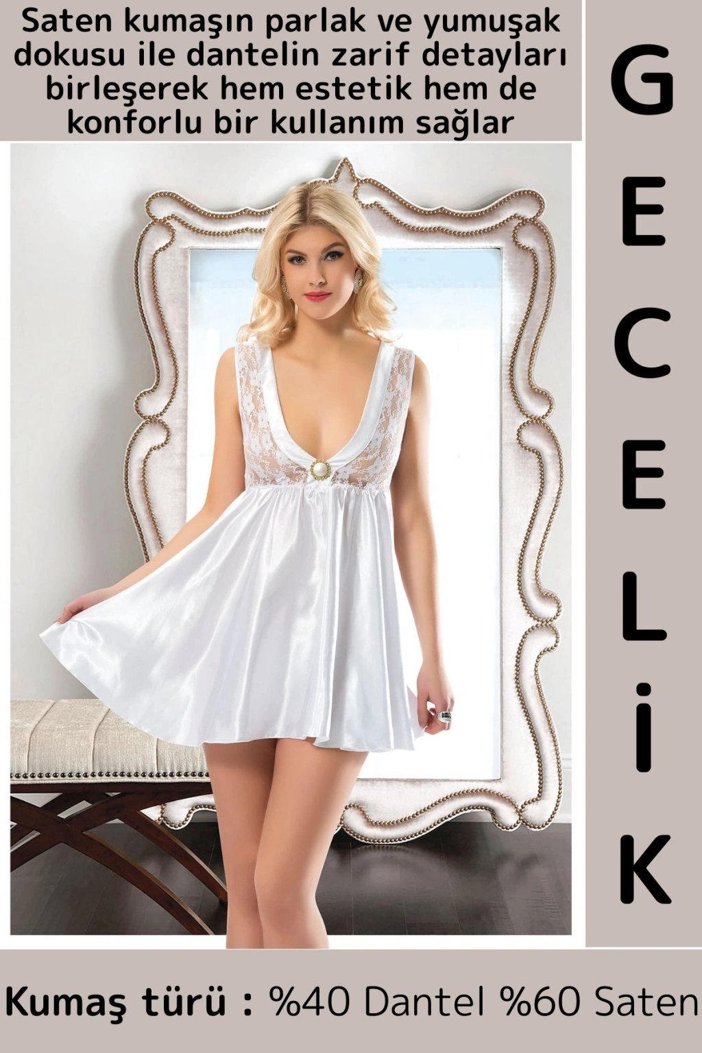 Dantelli Saten Beyaz Gecelik Üstün Kalitede Kumaşlardan üretilmiştir