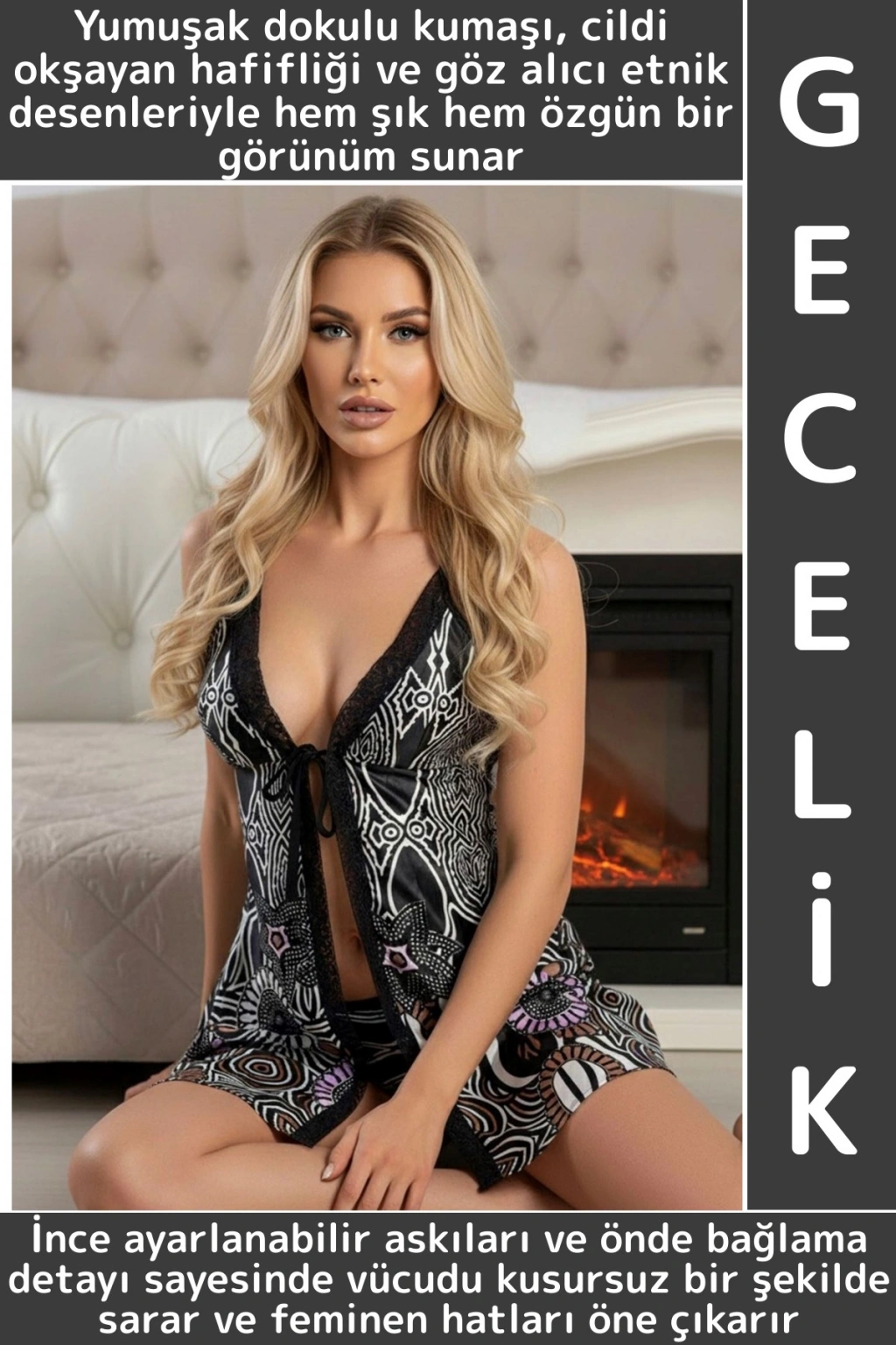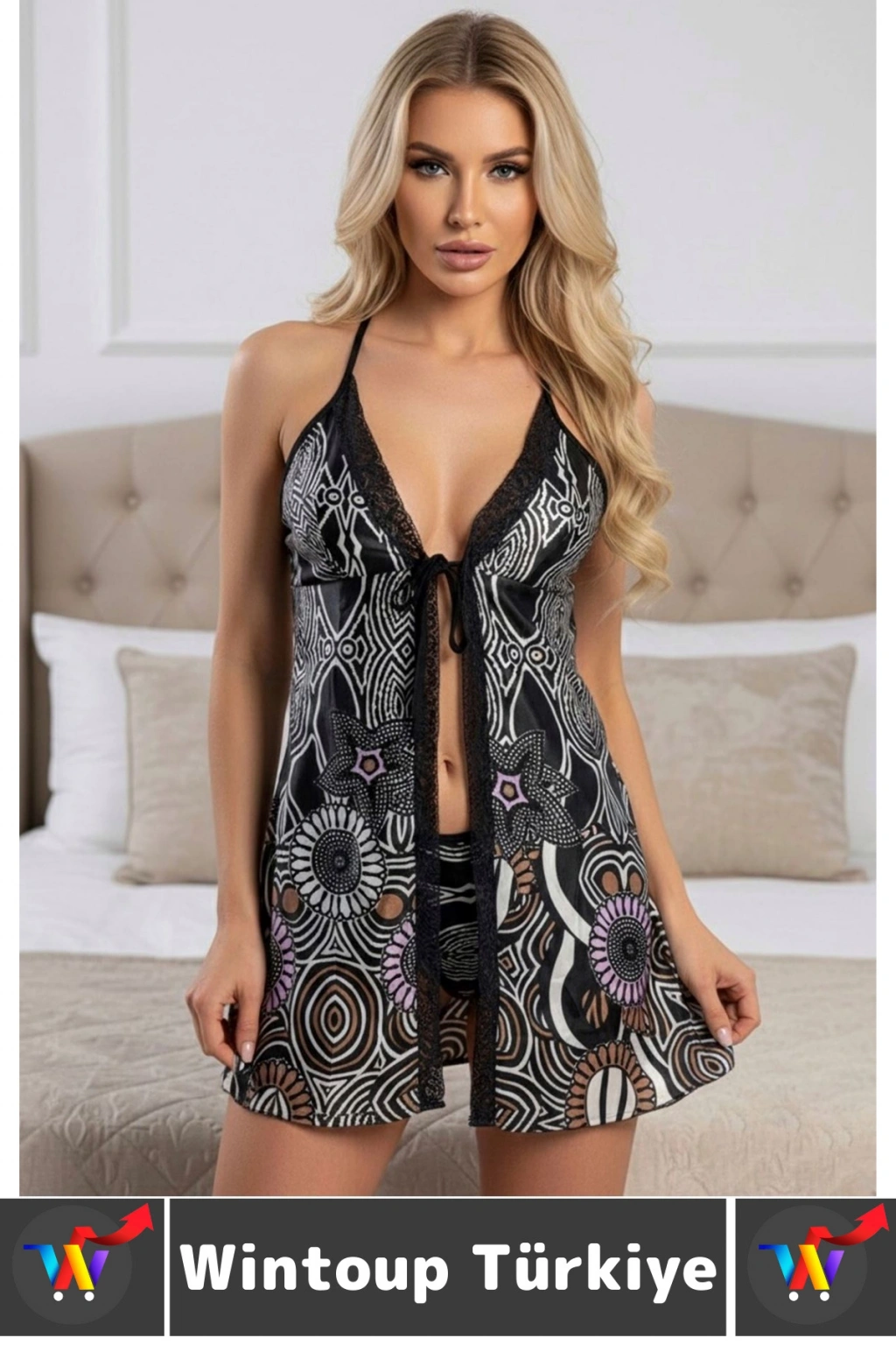 Zarif dantel detayları ve dikkat çekici etnik desenleriyle bu gecelik, feminen şıklığın en çarpıcı hâlini sunar. Hafif kumaşı ve bağlamalı tasarımıyla hem rahat hem de etkileyici bir görünüm sağlar. Romantik ve iddialı bir stil için ideal.